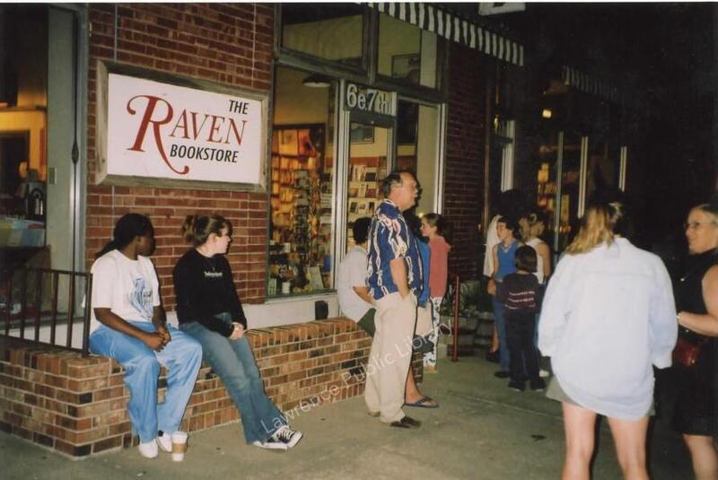 Photograph of the Raven Bookstore storefront before the midnight release of Harry Potter and the Order of the Phoenix. Bookstores were allowed to begin selling a newly-released Harry Potter book no earlier than midnight, so these devoted Harry Potter fans waited outside the Raven to get their hands on a new copy.