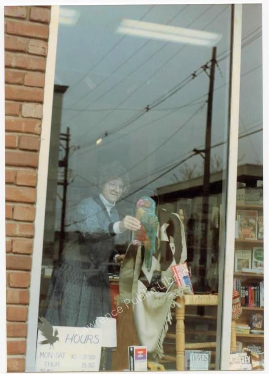 Wright, Mary Lou, “Photograph of Bernadette Traiger Creating Raven Bookstore Window Display, 1990.,” Digital Douglas County History, accessed December 1, 2025, https://lplks.omeka.net/items/show/1175.