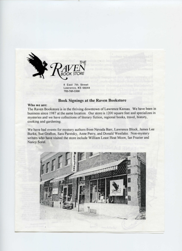 Wright, Mary Lou and Kehde, Pattie, “The Raven Bookstore Signings Promotional Pamphlet for Authors, 2000.,” Digital Douglas County History, accessed December 30, 2025, https://lplks.omeka.net/items/show/1182.