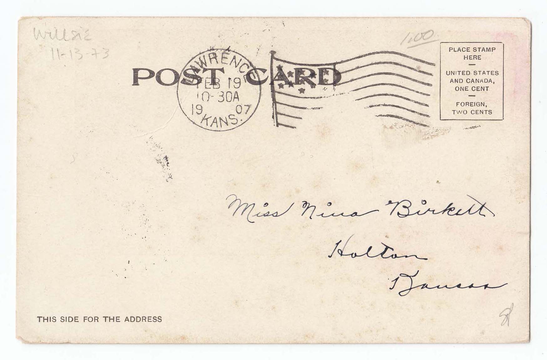 Postcard with a black and white photograph of an orchestra on the front. Photograph of depicts three rows of young men holdinging instruments, in the front is a banner with "Kansas' printed on it. At the bottom of the photograph "K.U. - '06 - '07" is printed in white ink. At the bottom of the left side "copyright is printed in white ink. A white border is around the entire photograph. At the bottom border is a note from Evan discussing stating that he is upset that he cannot visit Sallie. A black arrow is pointing to the back row on the left side. At the bottom of the left side "Squires - -Photo" is printed in black ink. On the back is the address of Miss Nina Birkett in Holton, Kansas. Postmarked February 19, 1907 in Lawrence, Kansas. Information on when and where the postcard was acquired is on the back, 11/13/1973 from Willsie.