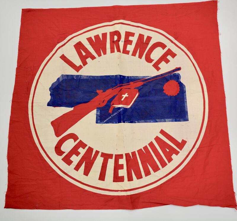 Large red flag with a while circle in the middle, with a blue outline of the state of Kansas overlaid with a red rifle and Bible and framed with the words 'Lawrence Centennial' on the top and bottom of the circle. The red rifle and Bible are references to Beecher's Bibles. Ian Schneck purchased this flag at a garage sale. There are multiple copies of this flag, including a framed version in Free State Brewing Company on Mass St.