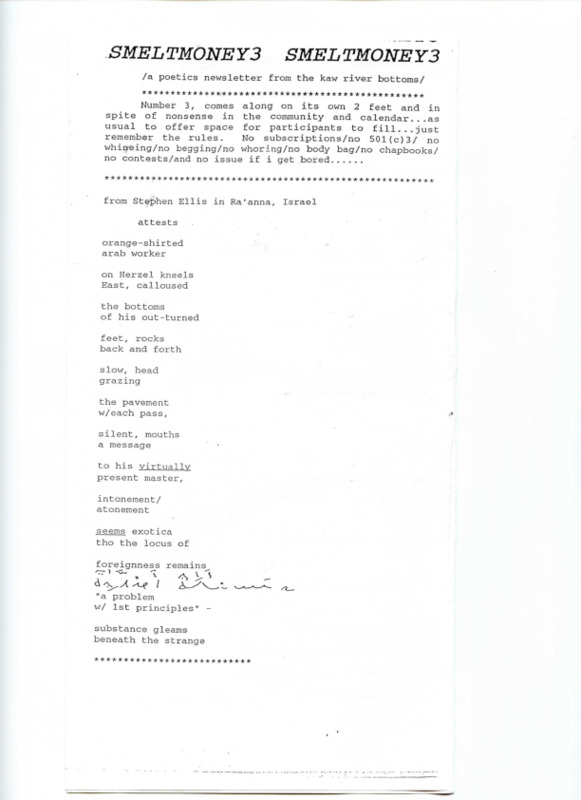 Third issue of Smelt Money, a zine circulated in Lawrence and Topeka between 1996-1999, featuring poetry from local Lawrence writers. Smelt Money had no formal publication routine, unlike several other zines circulated during this time.