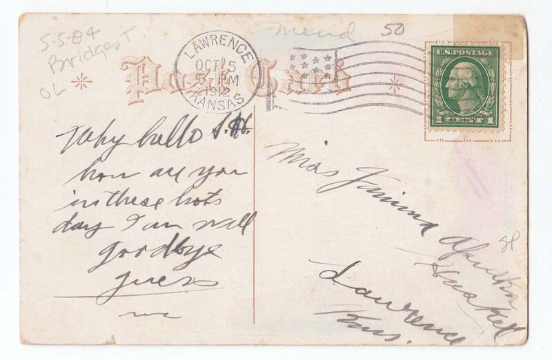 Souvenir postcard of the University of Kansas. On the front along the right side is a cutout photograph of a man holding a small stove, a blue and red banner with "K.U." printed in black Old English is to the left. Above the banner "Had a hot time in" is printed in black ink and below the banner "hugged the stove" is also printed in black ink. At the bottom of the left side "COP. S.A.S. 1912" is printed in black ink. On the back is a note to a student at Haskell from Lawrence, Kansas. Postmarked October 5, 1912. Information on when and from whom the postcard was acquired is on the back, 5/5/1984 from the Bridges.