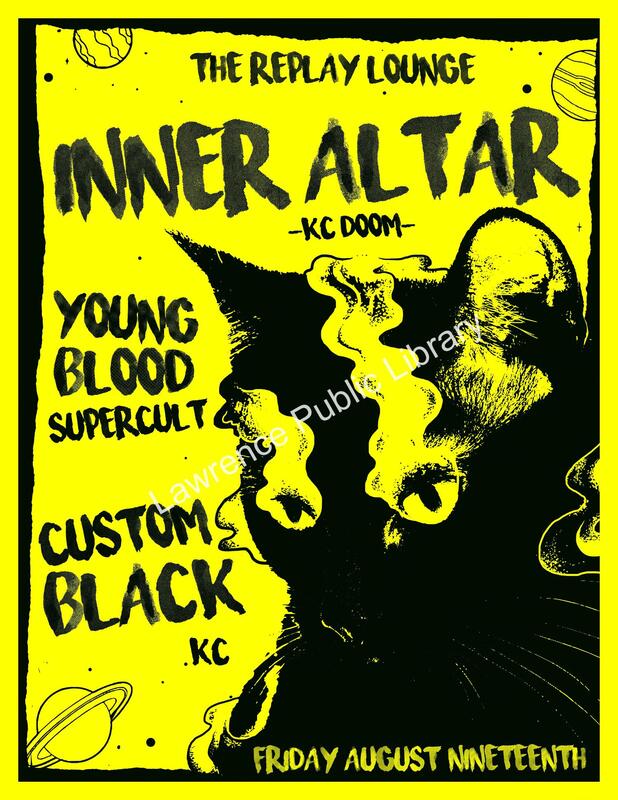 A concert poster for Inner Altar, designed by Tanner Spreer, a graphic design artist, Lawrence local, and band member of Psychic Heat. This poster was printed on a risograph, an alternative to silk-screen printing that allows designers to create complex, multilayered designs. Spreer became familiarized with risograph printing through a workshop with Oddities Prints in Kansas City. This poster was displayed throughout downtown Lawrence and on the University of Kansas campus.