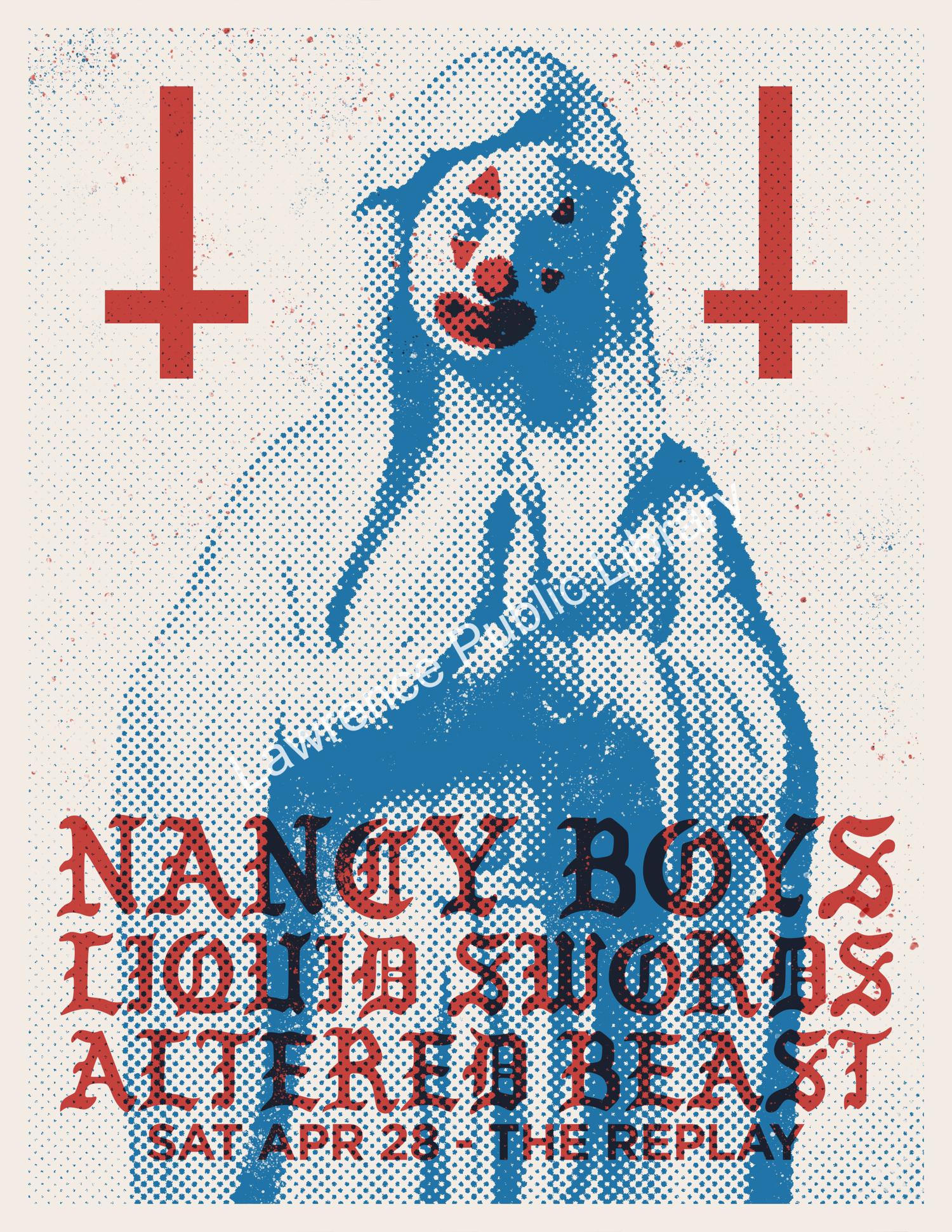 A concert poster for Nancy Boys, designed by Tanner Spreer, a graphic design artist, Lawrence local, and band member of Psychic Heat. This poster was printed on a risograph, an alternative to silk-screen printing that allows designers to create complex, multilayered designs. Spreer became familiarized with risograph printing through a workshop with Oddities Prints in Kansas City. This poster was displayed throughout downtown Lawrence and on the University of Kansas campus.