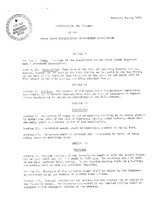 Brook Creek Neighborhood Improvement Association (Lawrence, Kan.), “Brook Creek Neighborhood Improvement Association Bylaws, March 1983,” Digital Douglas County History, accessed December 5, 2025, https://lplks.omeka.net/items/show/1273.