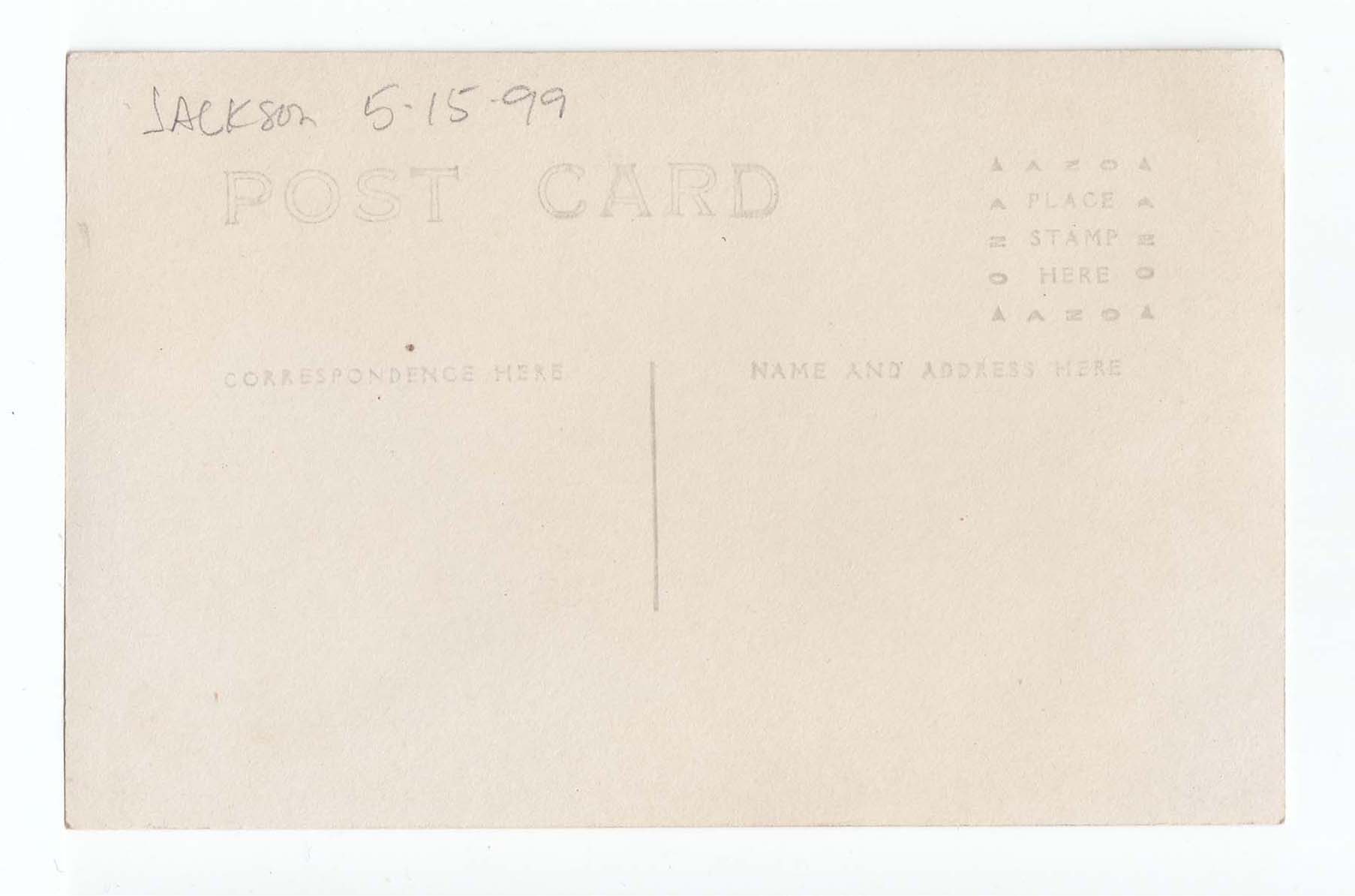 Postcard with a black and white photograph of Christmas stockings on the front. The stockings are hanging on a mantle and filled, a giant stocking sits beneath and it very full. A white border is around the entire photograph. At the top border "Christmas morning, 1913." is written in black ink. Information on when and where the postcard was acquired is on the back, 5/15/1999 at the Jackson Sale.