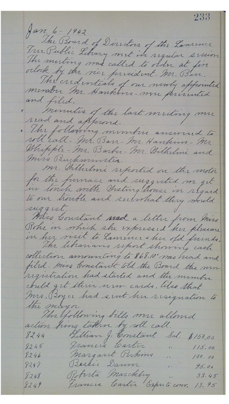 Lawrence Free Public Library (Lawrence, Kan.), “Library Board Minutes of the Lawrence Free Public Library for the Year 1942,” Digital Douglas County History, accessed November 28, 2025, https://lplks.omeka.net/items/show/1607.