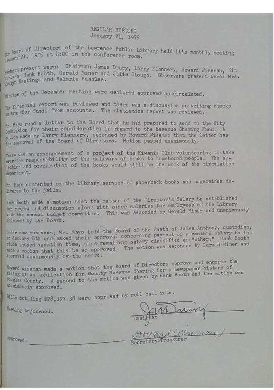 Lawrence Free Public Library (Lawrence, Kan.), “Library Board Minutes of the Lawrence Free Public Library for the Year 1975.,” Digital Douglas County History, accessed December 5, 2025, https://lplks.omeka.net/items/show/1653.
