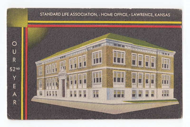 Postcard with a colored image of the Standard Life Association building on the front. Building is on a black background with a yellow and red border around the building. At the top "Standard Life Association, - Home Office, - Lawrence, Kansas" is typed in white ink. On the left side "Our 52nd Year" is in white ink. In 1933, the Fraternal Aid Association changed its name to Standard Life Association.