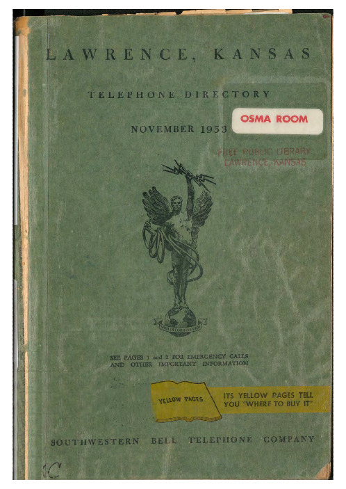 Southwestern Bell Telephone Company, “Nov 1953 Telephone directory, Lawrence, Kansas,” Digital Douglas County History, accessed November 28, 2025, https://lplks.omeka.net/items/show/1688.