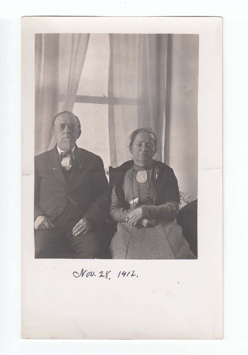Postcard with a black and white photograph of an elderly couple on the front. Both individuals are sitting, the man is on the left and the woman is on the right. A white border is around the entire photograph. At the bottom border "Nov. 28, 1912." is written in black ink. Information on when and where the postcard was acquired is on the back, 5/15/1999 at the Jackson Sale.