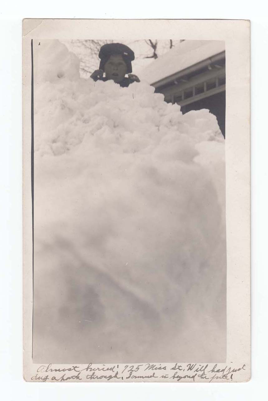 Postcard with a black and white photograph of a child in snow on the front. The child is looking down from the top of a snow pile. A white border is around the entire photograph. On the bottom border "Almost buried! 725 Miss St. Will had just dug a path through. Samuel is beyond the pile!" is written in black ink. On the back information on who is in the photograph is written in pencil, Will Weatherby (Olive Jackson's brother). Information on when and where the postcard was acquired is on the back, 5/15/1999 at the Jackson Sale.