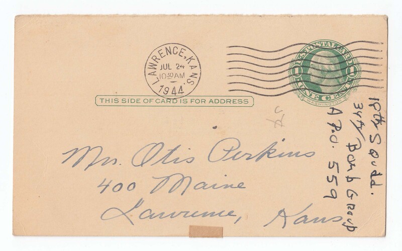 Postcard from The Lawrence Outlook. On the front is a letter asking for information on Otis I. Perkins' military information and location. Postcard was sent to Mrs. Otis Perkins at 400 Maine Street from Mrs. Frank E. Jones at 1140 East 13th Street, both in Lawrence, Kansas. On the back is Perkins' military information. Postmarked July 24, 1944. On the back is information on when and where the postcard was acquired, Frame Shop 5/11/2001.
