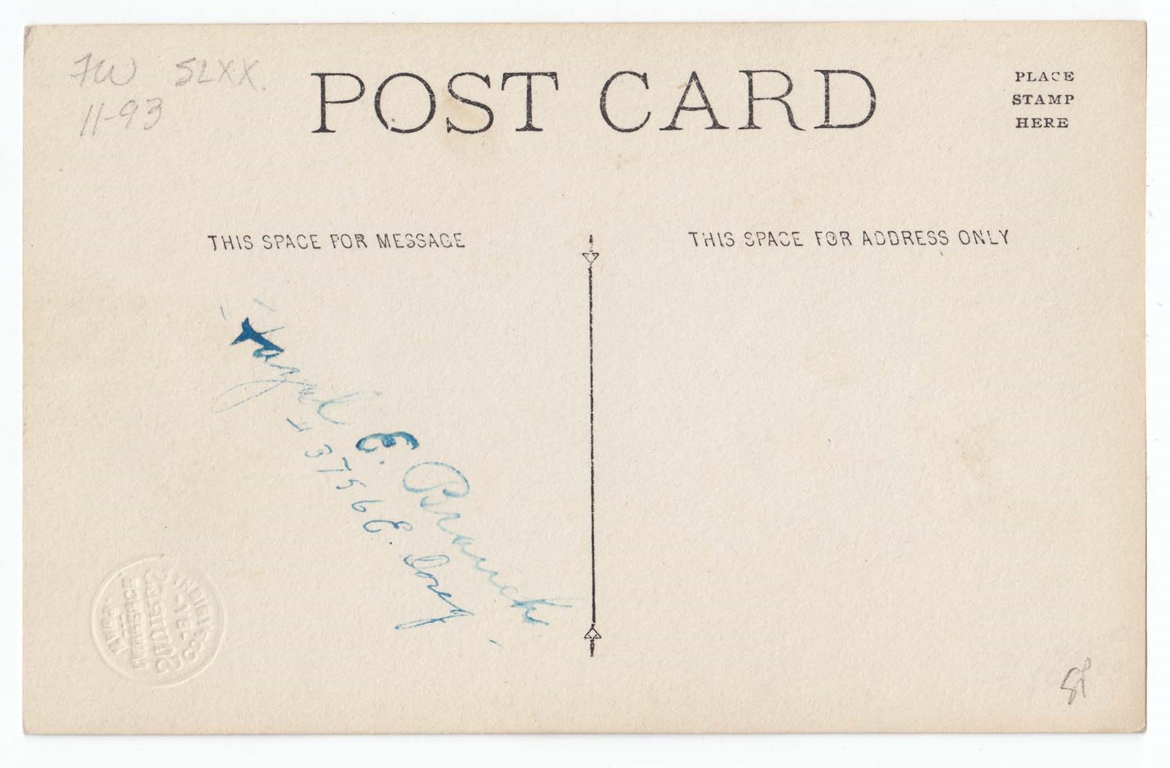 Postcard with a black and white photograph of a woman in traditional Native American dress on the front. Manufacturing information on front. Acquisition information on the back.