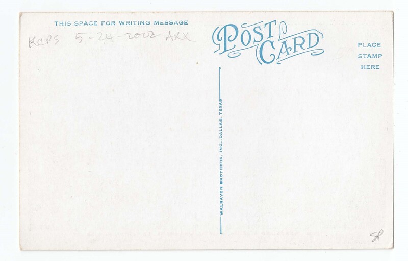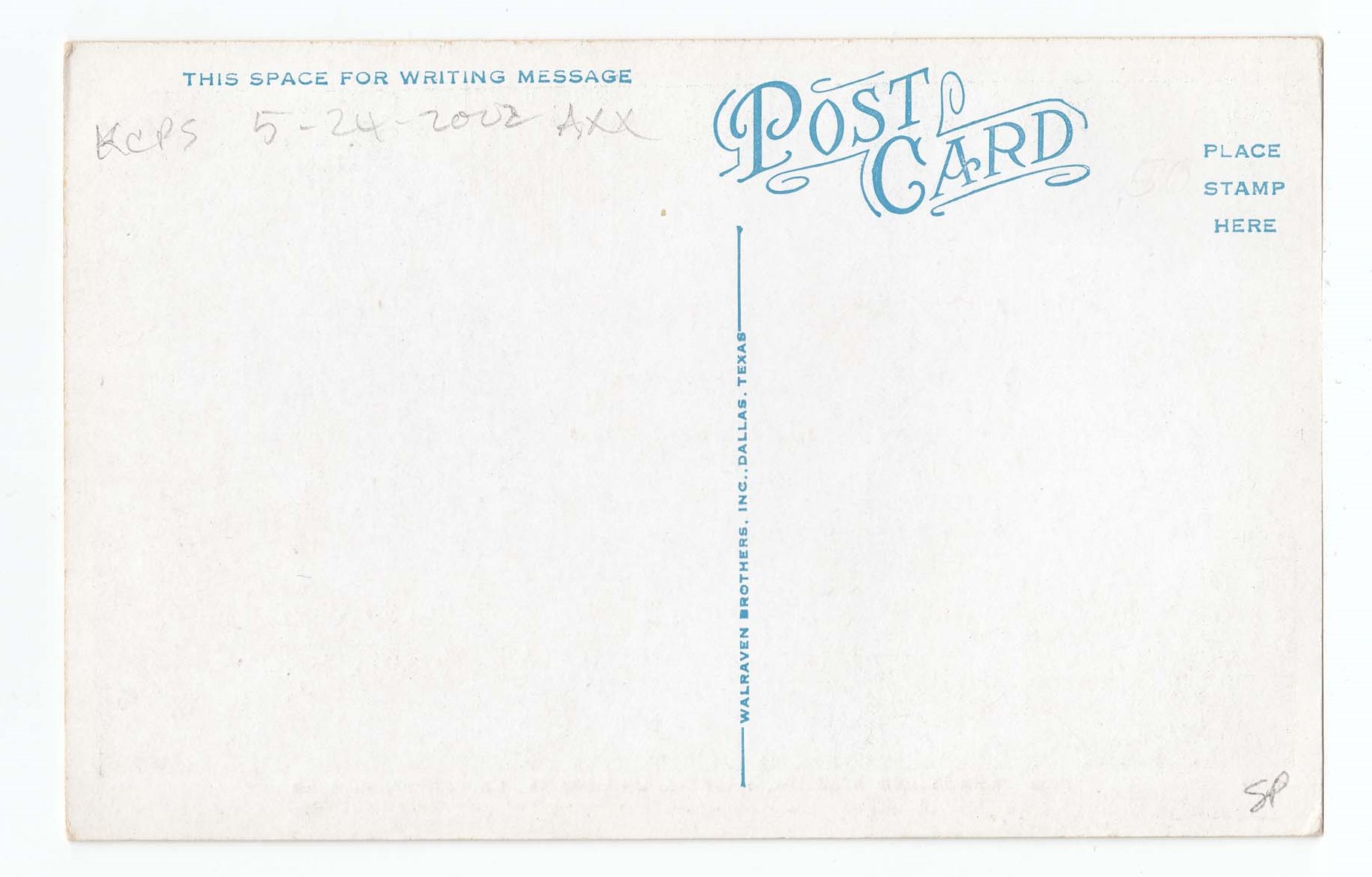 Postcard with a colored image of the stadium entrance at Haskell University on the front. The image is a black and white photograph with the sky colored in blue. There is a white border around the entire image. On the bottom border "1919 New Campus and Stadium, Haskell University, Lawrence, Kansas" is typed in black ink. On the back in the middle "Walraven Brothers, Inc., Dallas, Texas" is typed sideways in blue ink. Information on when and where the postcard was bought is on the back, 5-24-2002 from KCPS.