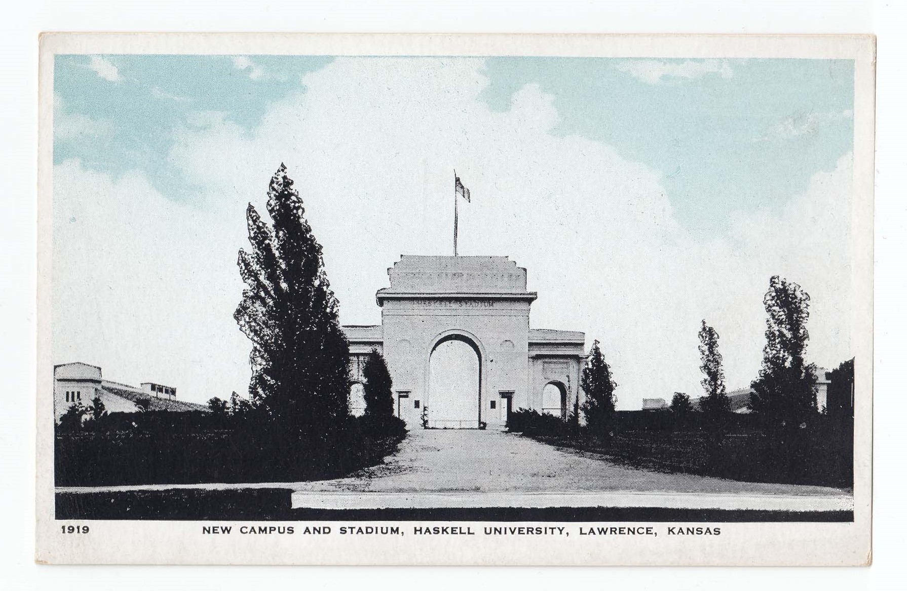 Postcard with a colored image of the stadium entrance at Haskell University on the front. Manufacturing information on the back. Acquisition information on the back.