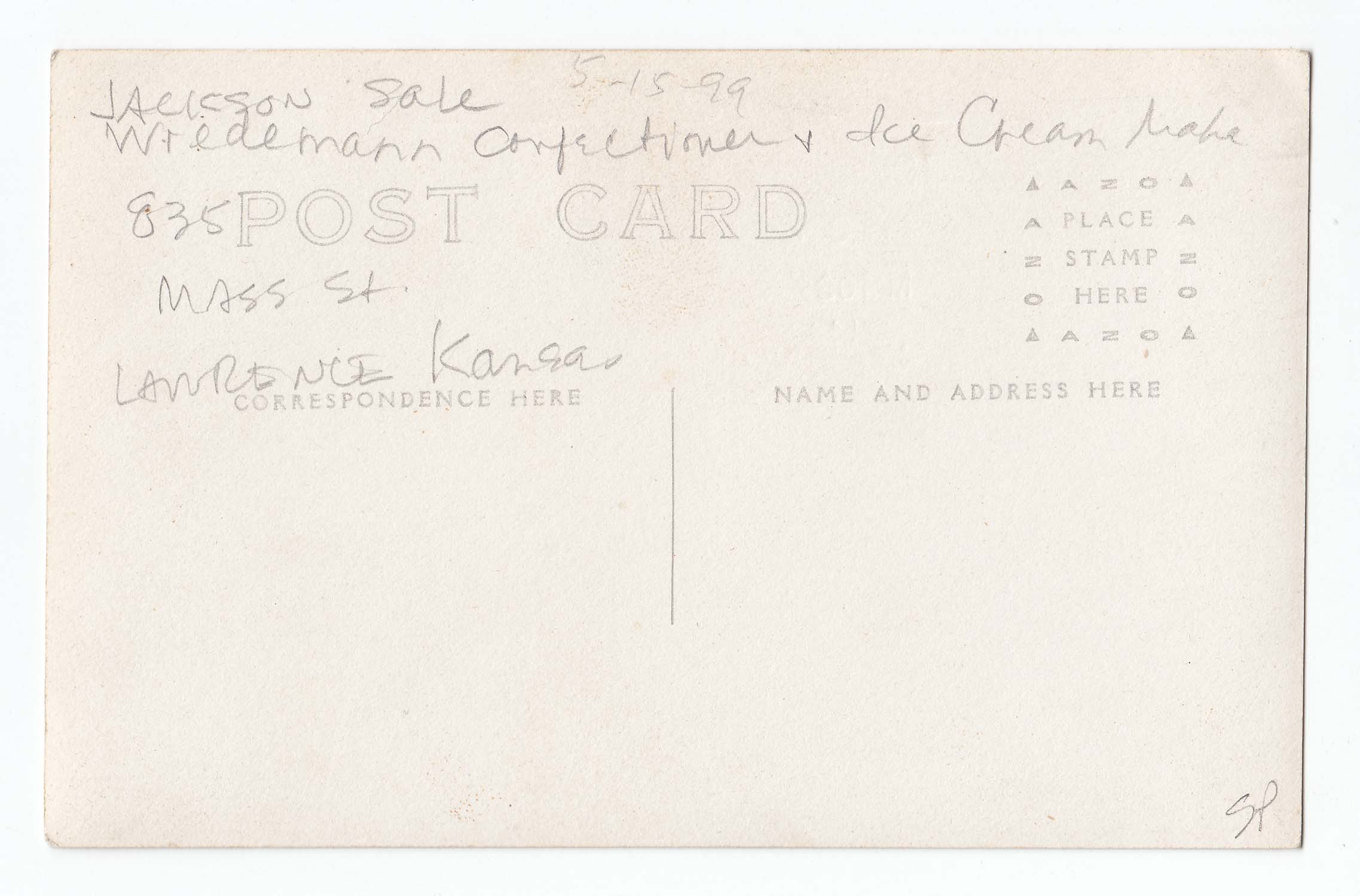Postcard with a black and white photograph of Wiedemann Confectioner and Ice Cream Manufacturer