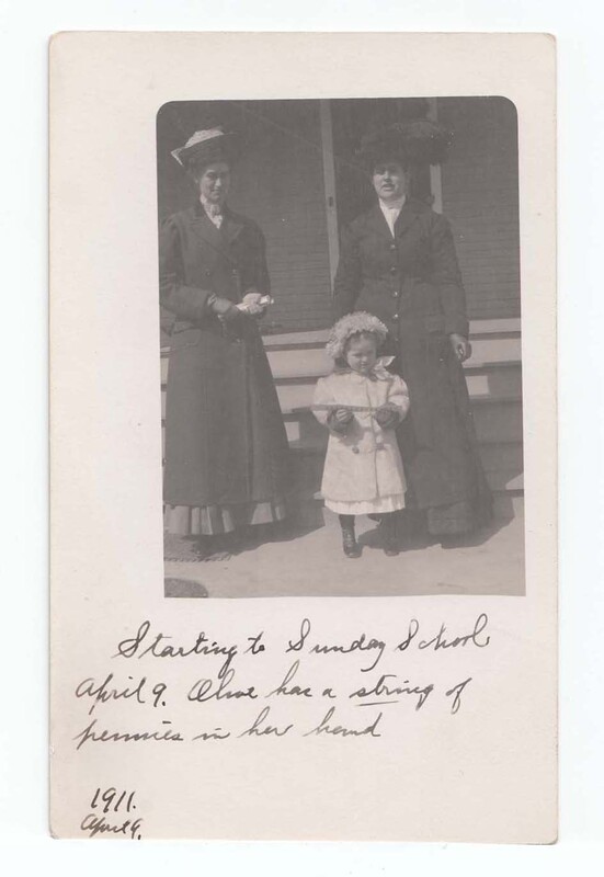 Postcard with a black and white photograph two women and a young girl on the front. The two women are standing in front of stairs in dark coats, the young girl is standing in front of the women. A white border is around the entire photograph. On the bottom border "Starting to Sunday Schools April 9. Olive has a string of pennies in her hand" is written in black ink. At the bottom left corner "1911. April 9." is written in black ink. On the back the location of where the photograph was taken is written in pencil, 1017 Indiana. Information on when and where the postcard was acquired is on the back, 5/15/1999 at the Jackson Sale.