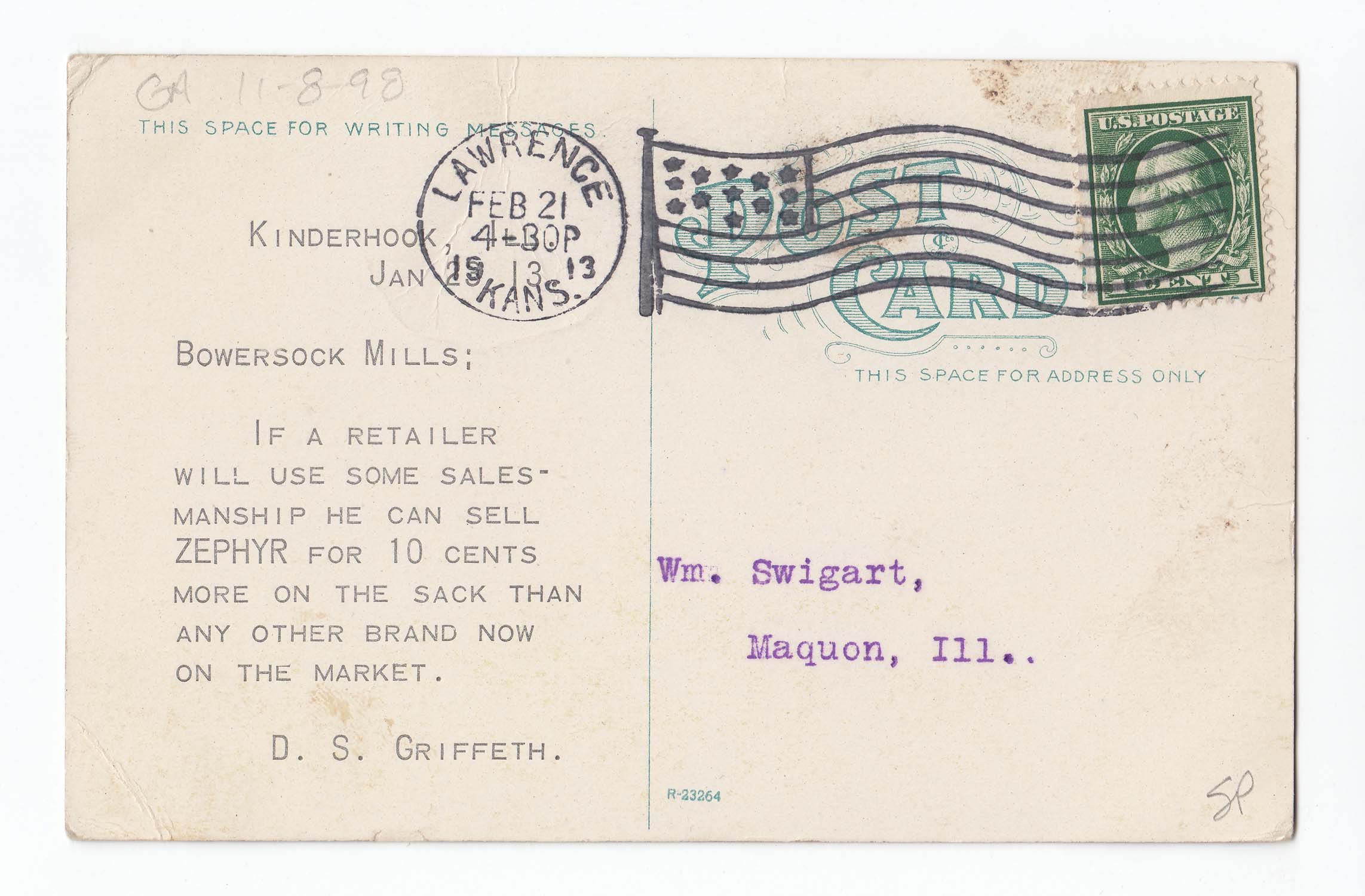 Postcard with a colored image of Bowersock Mills on the front. Image is of the two mills with the bridge in the foreground and the railroad tracks underneath. Image is a photograph colored in by hand. At the top of the left side "Home of Zephyr Flour. Bowersock Mills and Power Co., Lawrence, Kansas." is typed in black ink. A testimony is typed on the back about the quality of Zephyr Flour written by D.S. Griffeth. Postcard is address to William Swigart in Maquon, Illinois.Postmarked February 21, 1913. Information on when and where the postcard was acquired is on the back, 11/8/1998 from GA.