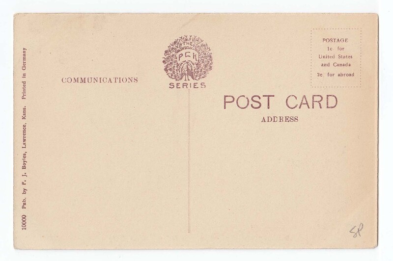Postcard with a black and white photograph of the Lawrence National Bank building on the front. Photograph focuses on the front corner door of the building. The Lawrence Business College sign can be seen on the first floor of the building on the right side as well as on the windows of the third floor. On the right side of the building "The Lawrence Business College" is printed in black ink. A white border is around the entire photograph. On the bottom border "Lawrence, Kans. Lawrence National Bank Bldg." is printed in red ink. On the back along the left side "10000 Pub. by F.J. Boyles, Lawrence, Kans. Printed in Germany" is printed sideways in red ink.