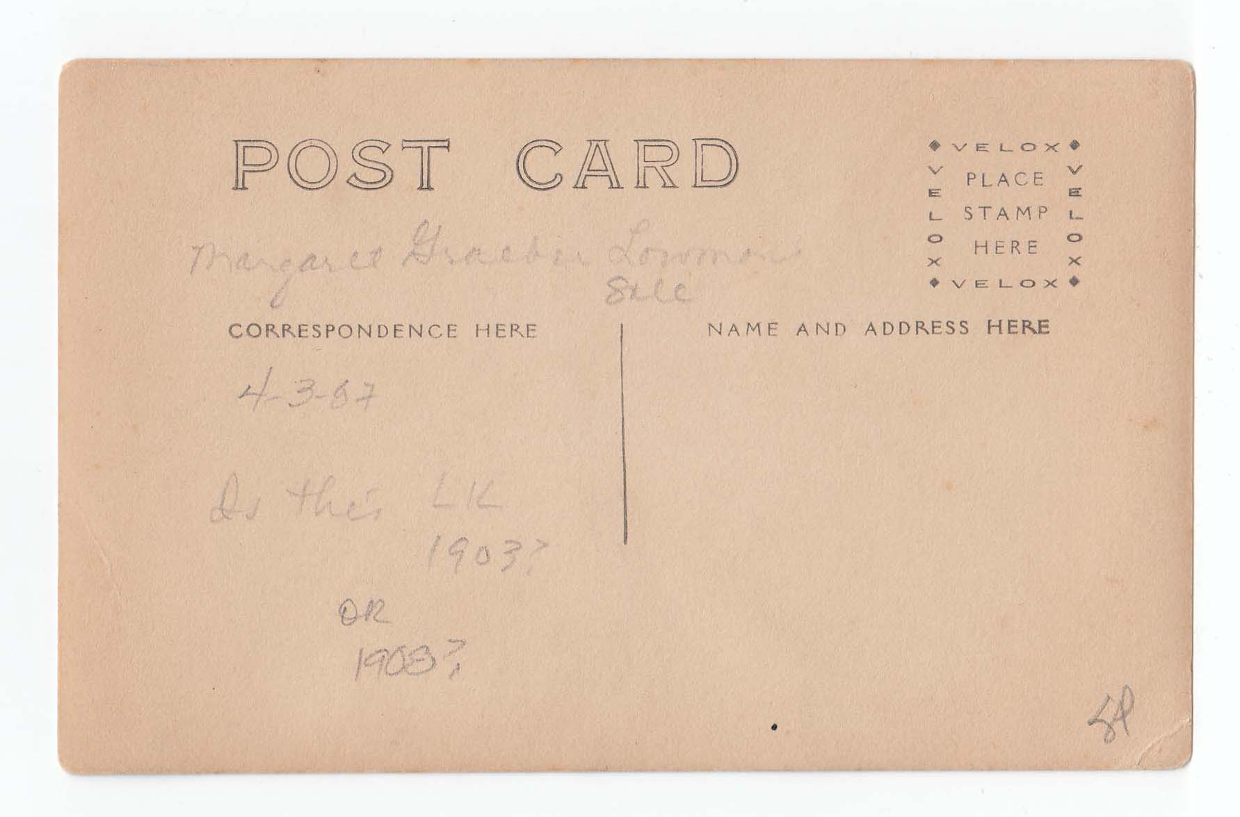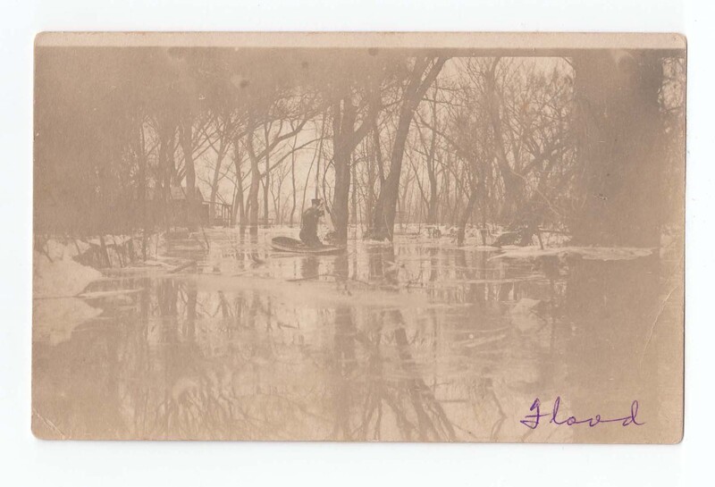 Postcard with a black and white photograph of a man in a boat in a flooded area of Lawrence on the front. Photograph depicts the uniformed man in a boat in a flooded wooded area, a house can be seen in the background. At the bottom right side "Flood" is written in blue ink. On the back is information on when and where the postcard was acquired, 4/3/1987 from the Margaret Lowman sale.