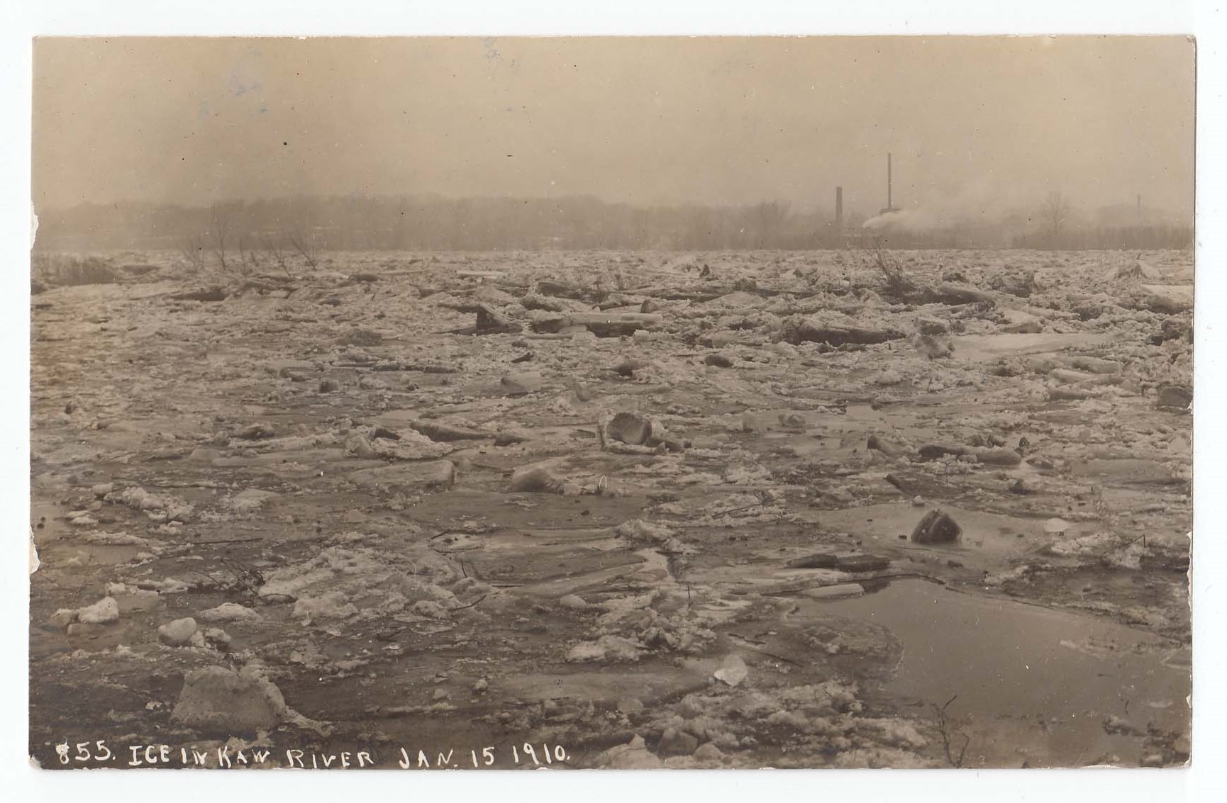 Postcard with a black and white photograph of an ice gorge on the Kaw River on the front. Photograph depicts the river covered in ice sheets. At the bottom of the photograph "855 Ice in Kaw River Jan. 15, 1910." is printed in white ink.