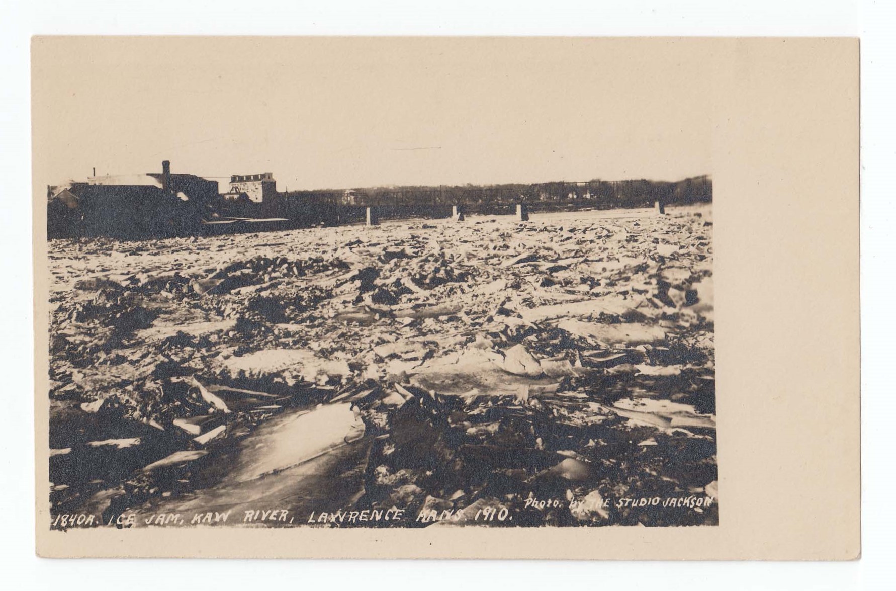 Postcard with a black and white photograph of an ice gorge on the Kaw River on the front. Photograph depicts the river covered in ice sheets, the bridge and Bowersock Mills are in the background. At the bottom of the photograph "1840A Ice Jam, Kaw River, Lawrence Kans. 1910. Photo by The Studio Jackson" is printed in white ink. A white border is around the entire photograph. On the back "Mfgd. by M.L. Zercher Book and Sta. Ca., Topeka, Kan." is typed sideways in black ink. A note is written on the back from Mrs. McKee to her children. Information on when and where the postcard was acquired is on the back, 2/10/1973 from Falls.