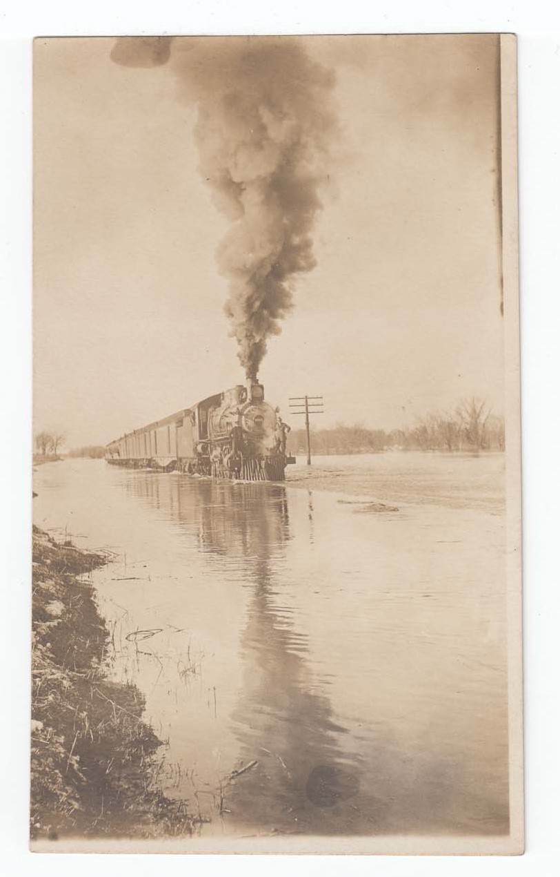 Postcard with a black and white photograph of a train in high water on the front. Acquisition information on the back.