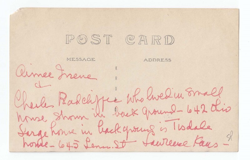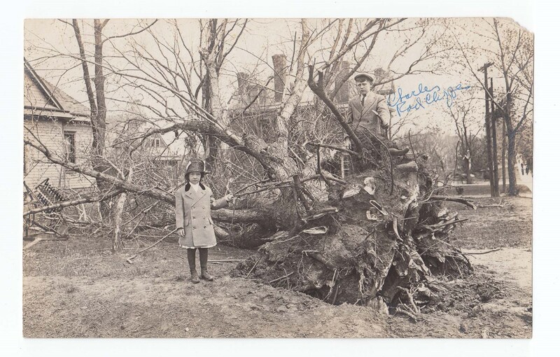 Postcard with a black and white photograph of the Tisdale yard after the 1911 tornado on the front. Photograph depicts a girl holding on to a fallen tree's root and a boy standing on the roots. Next to the boy "Charles Radcliffe" is written in blue ink. On the back is a information on the two children in the photograph, Aimee Ivrene and Charles Radcliffe.