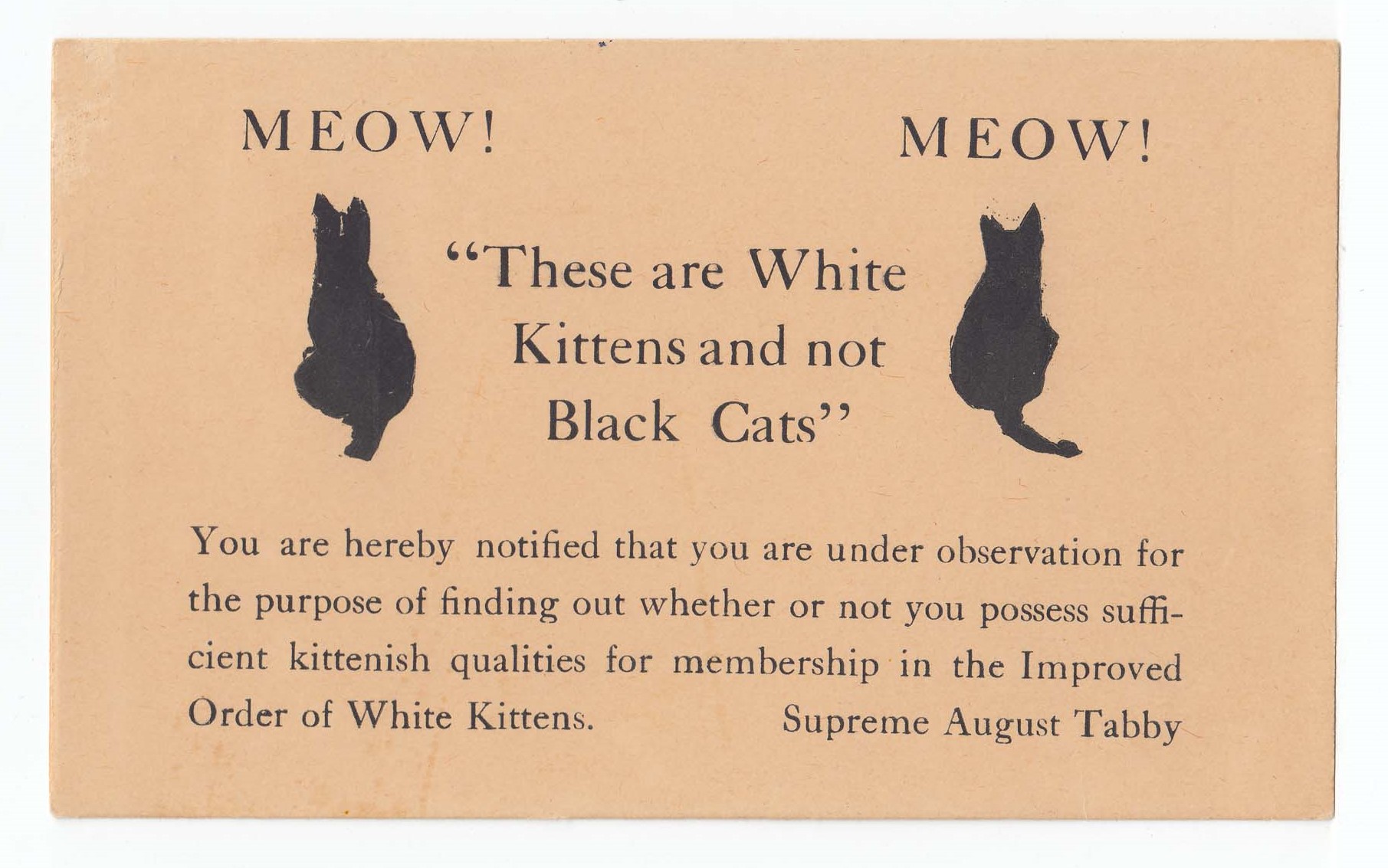 Postcard with a note from the Improved Order of the White Kittens on the front. The note is from the Supreme August Tabby. Above the note are two outlines of cats.