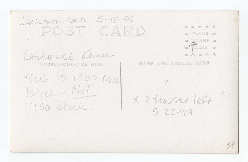 Postcard with a black and white photograph of the 1100-1200 block of Mississippi on the front. Photograph is from a distance and shows several different houses. At the bottom of the photograph "1100 block Miss St. From Golf links showing cut for paving street." is written in black ink. A black border is at the top and the bottom of the photograph. On the back of the postcard Sally Postma wrote that the location is not the the 1100 block but the 1200 block of Mississippi and that there are only two houses left as of May 22, 1999. Information on when the and where the postcard was acquired is on the back, 5/15/1999 from the Jackson Sale.