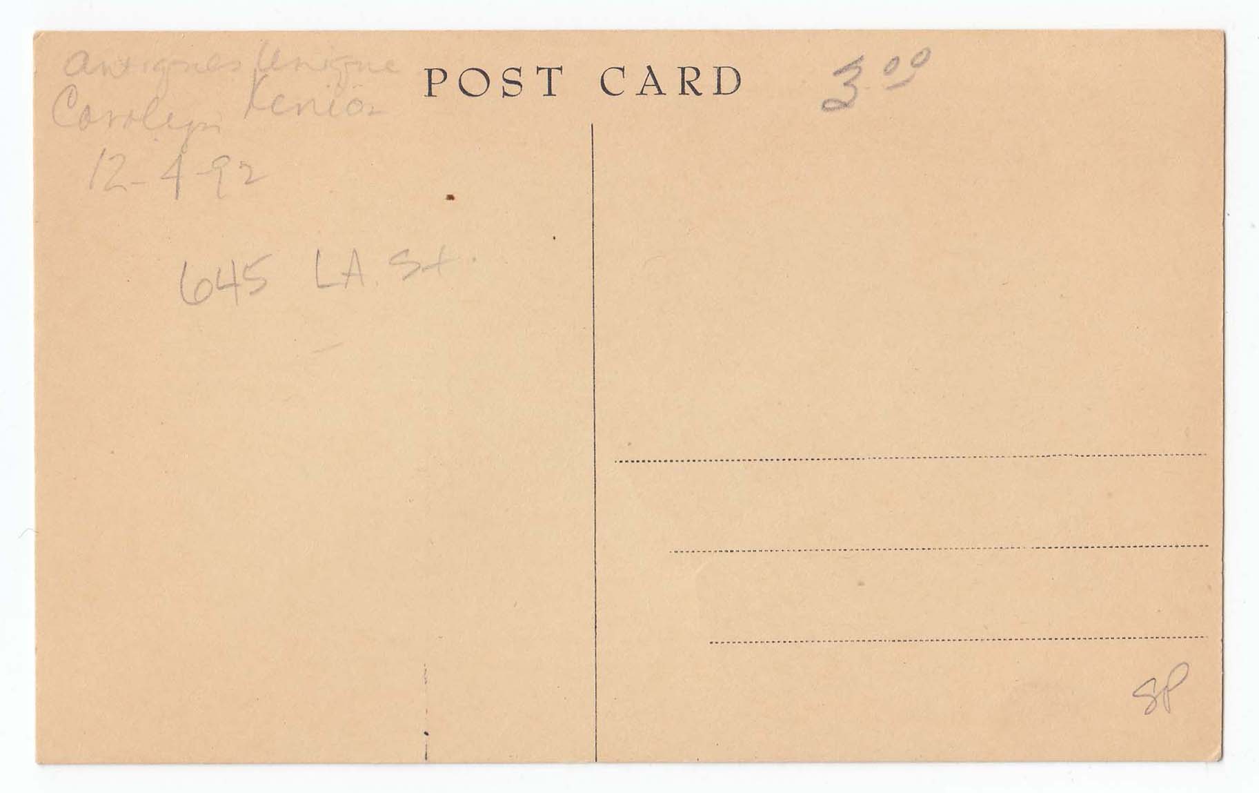 Postcard with a black and white photograph of Lawrence Business College on the front. The photograph is small and printed on the left side of the photograph and focuses on the side of the building. Below the photograph "Lawrence Business College, Lawrence, Kansas Established 1869 The First Business College in Kansas" is printed in black ink. On the back of the postcard is information on when and where the postcard was acquired, 12/4/1992 from Antiques Unique. Note: College moved to the National Bank building on Massachusetts Street.