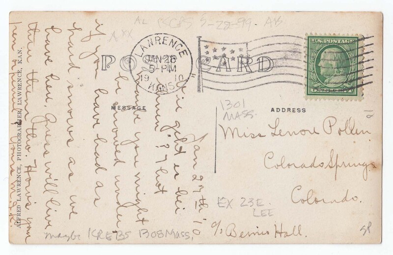 Postcard with a black and white photograph of the Sigma Chi house on the front. Photograph focuses on the front and right side of the building. A white border is around the entire photograph. At the top of the postcard "This is Sigma Chi house across the street from us. Will send you a view of our new home." is written in black ink. On the back along the left side "Alfred Lawrence, Photographer, Lawrence, Kan." is printed sideways in black ink. A note is written on the back to Miss Lenore Pollen in Colorado Springs, Colorado from M.J.K. is Lawrence, Kansas. Dated January 27, 1910 and postmarked January 28, 1910. Information on when and where the postcard was acquired is on the back, 5/28/1999 from KCPS. Note: Sigma Chi is listed at 23 East Lee Street in the 1909 directory, Lee Street is now Thirteenth Street.