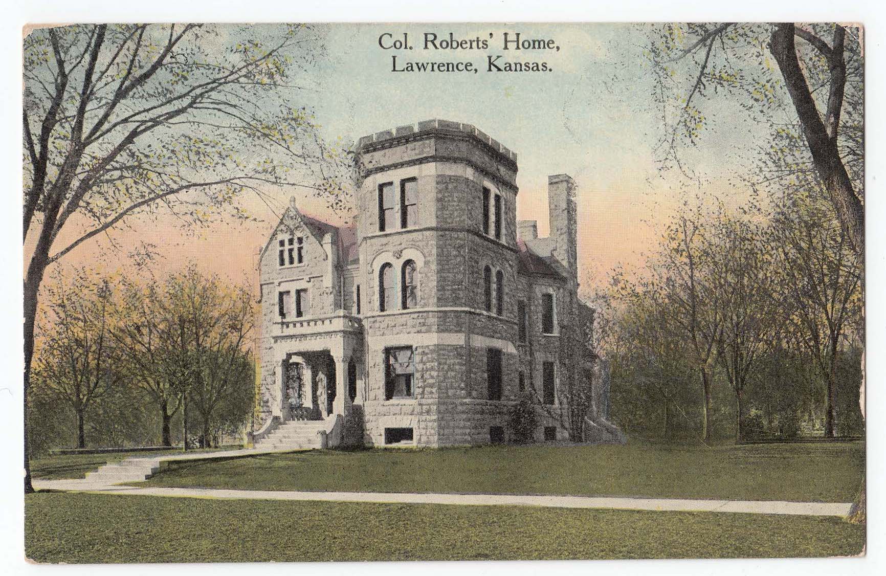 Postcard with a colored image of Colonel Robert's Home in on the front. Image shows the front and the left side of the building as well as the path leading up to the house. At the top of the postcard "Col. Roberts' Home, Lawrence, Kansas." is printed in black ink. On the back is a note to Miss Anita Martin in Wellington, Kansas from her father in Fort Riley, Kansas. Dated November 24, 1918 and postmarked November 25, 1918. Information on when and where the postcard was acquired is on the back, 5/2/1989 from Hal O. Note: This is now the Castle Tea Room.