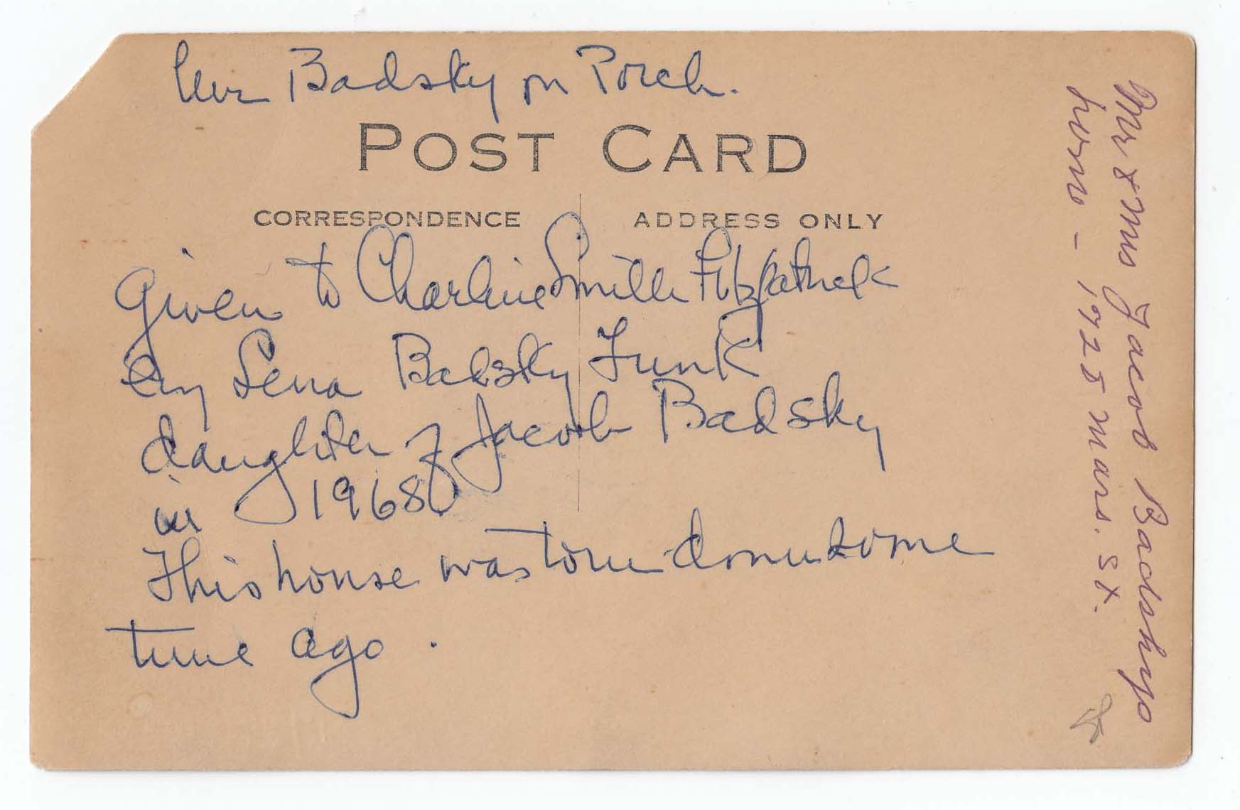 Postcard with a black and white photograph of the Badskys' house on the front. Photograph shows the house from the front with Jacob Badsky standing on the front porch. At the bottom of the right side "1728 Mass" is written in blue ink. On the left side "Badsky" is written sideways in blue ink. On the back along the right side "Mr. & Mrs. Jacob Badsky's house - 1728 Mass St." is written sideways in blue ink. In the middle of the card Charline Fitzpatrick has written that Lena Badsky Funk (daughter of Jacob Badsky) gave her the card in 1968. It is also noted that the house was torn down.