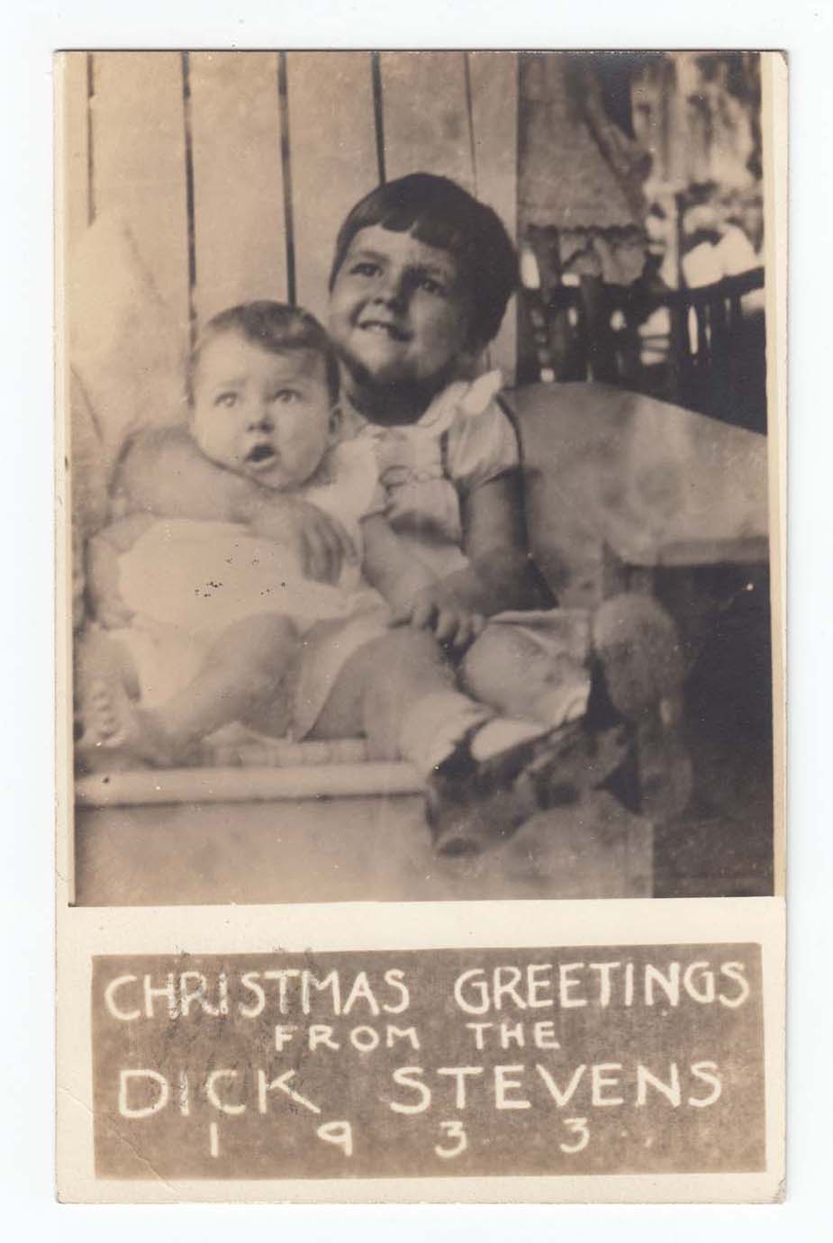 Postcard with a Christmas greeting from Dick Stevens on the front. At the top of the postcard is a black and white photograph of two young children sitting in a chair. At the bottom of the postcard is a black rectangle with "Christmas Greetings from the Dick Stevens 1933" printed in white ink. A white border is around the photograph and print box. On the back the postcard is addressed to Judge & Mrs. C.A. Smart at 18 East 13th, Lawrence, Kansas. Information on the photograph is on the back, Stevens located at either 1123 Louisiana Street or 2239 Massachusetts Street. Information on when the postcard was acquired is on the back, 10/30/1976.