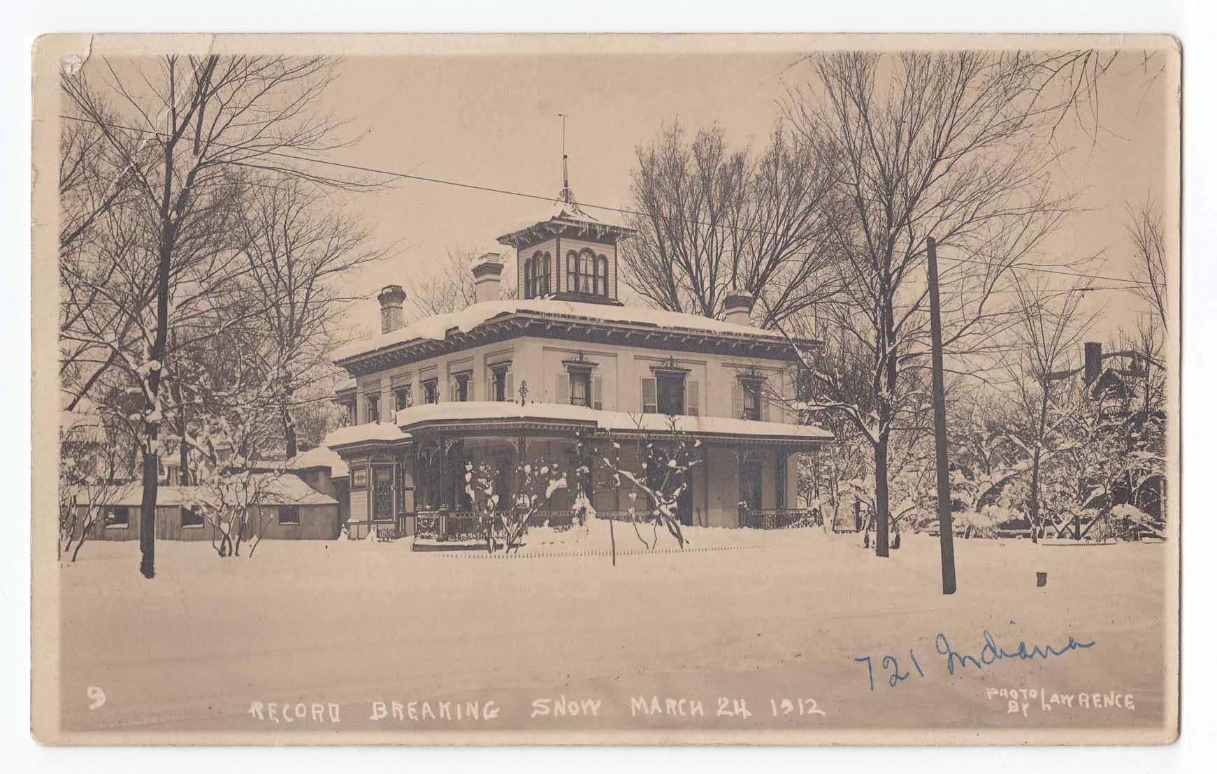 Postcard with a black and white picture of the 1912 record breaking snowfall on the front. Photograph focuses on the side of the house and surrounding property of Frederick W. Barteldes, president and founder of Barteldes Seed Co., covered in snow. At the bottom of the photograph "9 Record Breaking Snow March 24 1912 Photo by Lawrence" is printed in white ink. Above "Lawrence" "721 Indiana" is written in blue ink. A white border is around the entire photograph. On the back is information on the house in the photograph written in red ink.