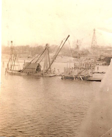 A dim snapshot of some of the equipment used to repair the Kaw River bridge after the 1903 flood.