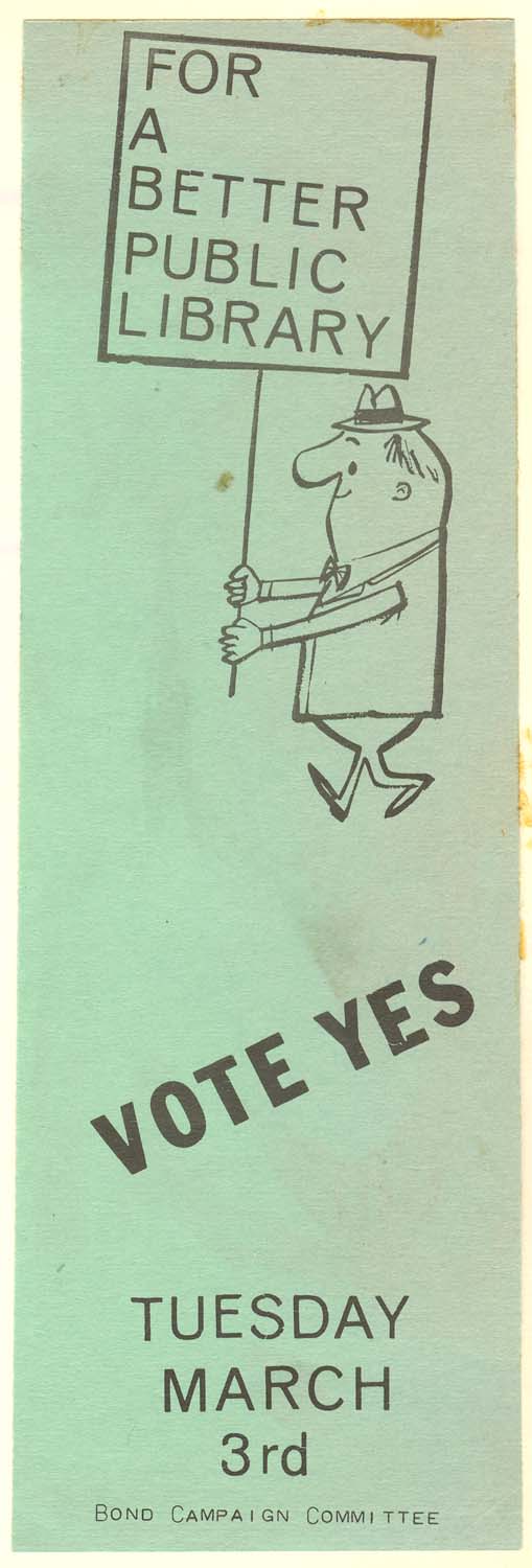 A bookmark urging people to vote yes on the new library bond issue. The bookmark shows a cartoon man holding up a sign that reads "For a Better Public Library."